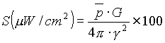 式中: P──发射机功率,KW; G──相对于半波偶极子的天线增益,DB; r──被测点与发射天线的距离,Km; F(θ)──天线垂直面方向性函数(视天线型式和层数而异)。 A.2.5.4 雷达等微波功率密度S计算公式: